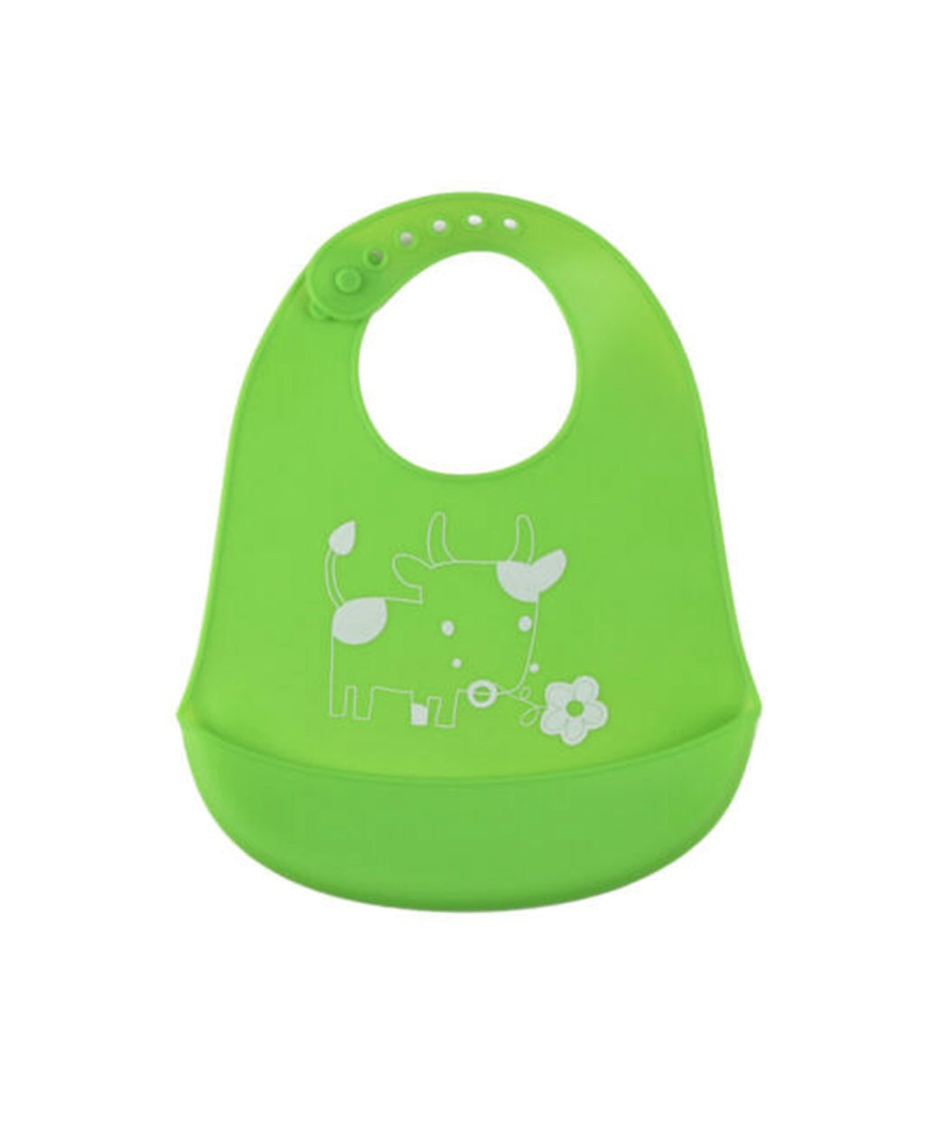 A lightweight and flexible feeding bib made from soft silicone. Designed to protect clothes from messes, it features a spill-catching pocket and an adjustable closure for growing babies.